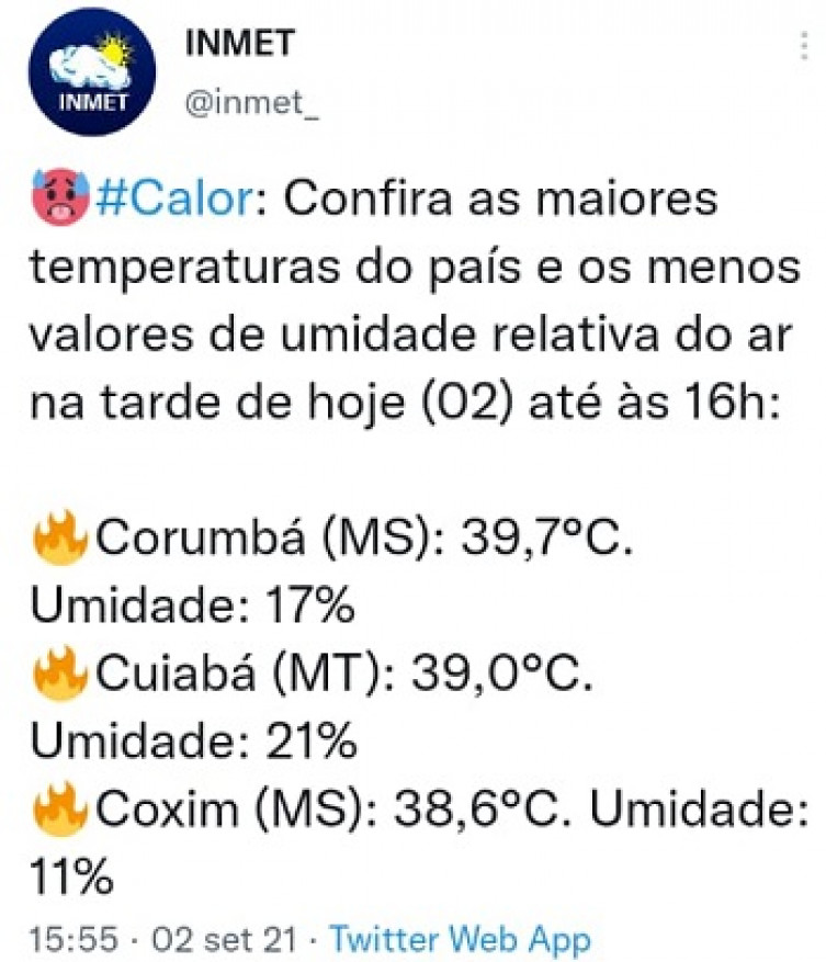 Não diferente, nesta quinta-feira, 02 de setembro, até às 15h (horário de MS), Corumbá registrou a maior temperatura do Brasil, com os termômetros chegando à casa dos 39,7°Celsius, segundo divulgação do Instituto Nacional de Meteorologia no Twitter. Cuiabá, no Mato Grosso, registrou 39ºC e Coxim, outra cidade sul-mato-grossense, 38,6ºC.