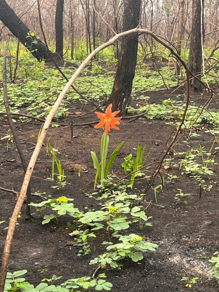 “Eu fiz questão de trazer essa foto, que tirei ontem na região de Miranda, nas margens da rodovia BR-262, onde a gente teve um incêndio no começo do mês de agosto, muito grave. E aí a gente vê como é a resiliência do bioma Pantanal. A gente observa aqui as árvores, a vegetação queimada, as cinzas. Estou com o cheiro das cinzas no meu EPI, mas a gente vê o lírio brotando, a vegetação ali insistindo em viver. Então é por isso que a gente trabalha tanto e se dedica para continuarmos vendo esse milagre acontecendo aqui”, finaliza Inoue.