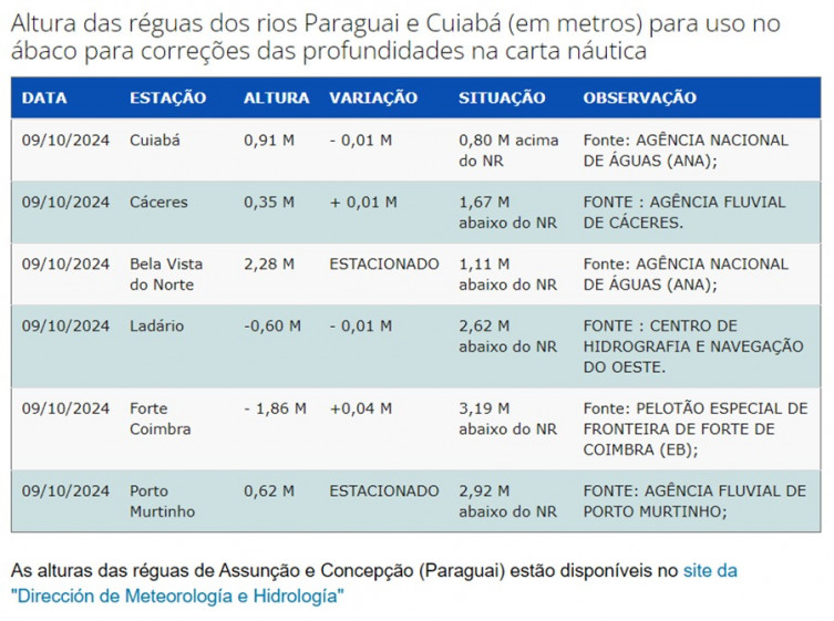 Com a marca de -60 cm de altura atingida nesta quarta, o Centro de Hidrografia e Navegação do Oeste, mostra que o rio Paraguai está 2,62 metros abaixo do nível de redução – profundidade de referência que ainda garante segurança para quem navega utilizando as cartas náuticas.