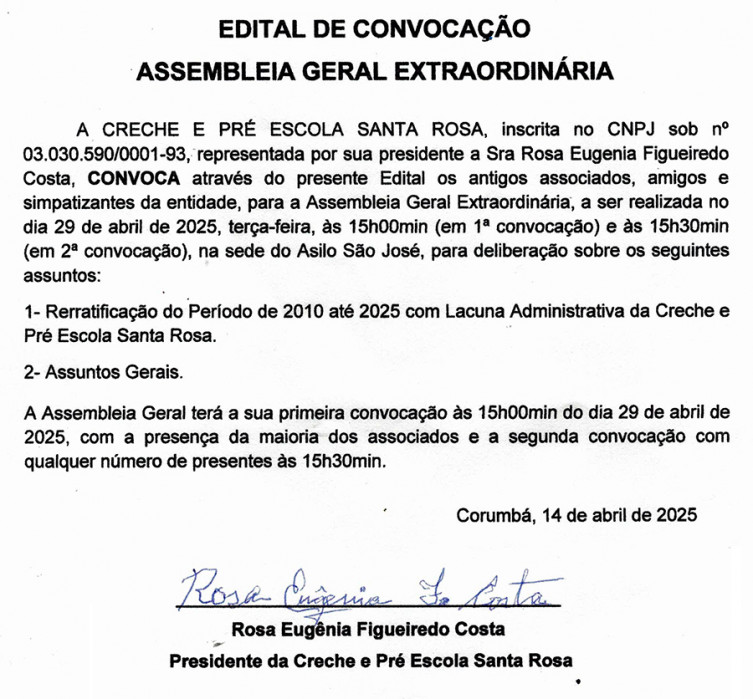 Edital de Convocação - Assembleia Geral Extraordinária Creche Pré-Escola Santa Rosa