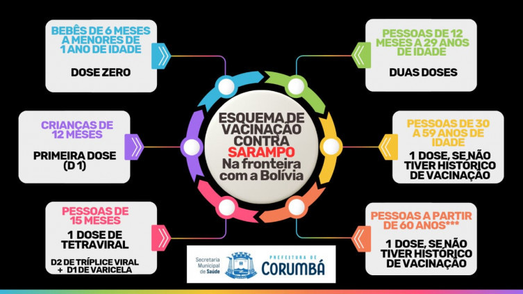 A Bolívia enfrenta um surto de casos de sarampo, que se concentram principalmente no Departamento de Santa Cruz de la Sierra, distante pouco mais de 600 km da fronteira com Corumbá. O Brasil tem apoiado as ações do País vizinho e enviou no dia 12 de julho, 600 mil doses de vacina contra a doença para a campanha de imunização. Toda a logística de entrega às autoridades de saúde bolivianas foi feita pela Prefeitura de Corumbá.
