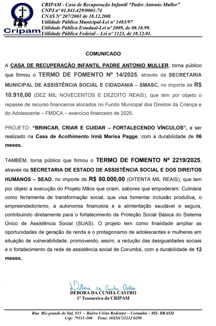 Comunicado da Casa de Recuperação Padre Antonio Muller