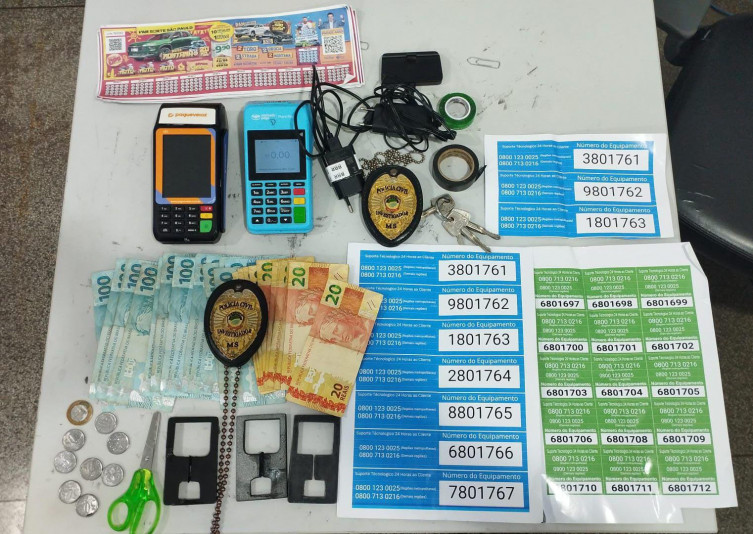 Dinheiro, máquinas de cartão, dispositivos “chupa-cabra” e adesivos falsos apreendidos com acusado