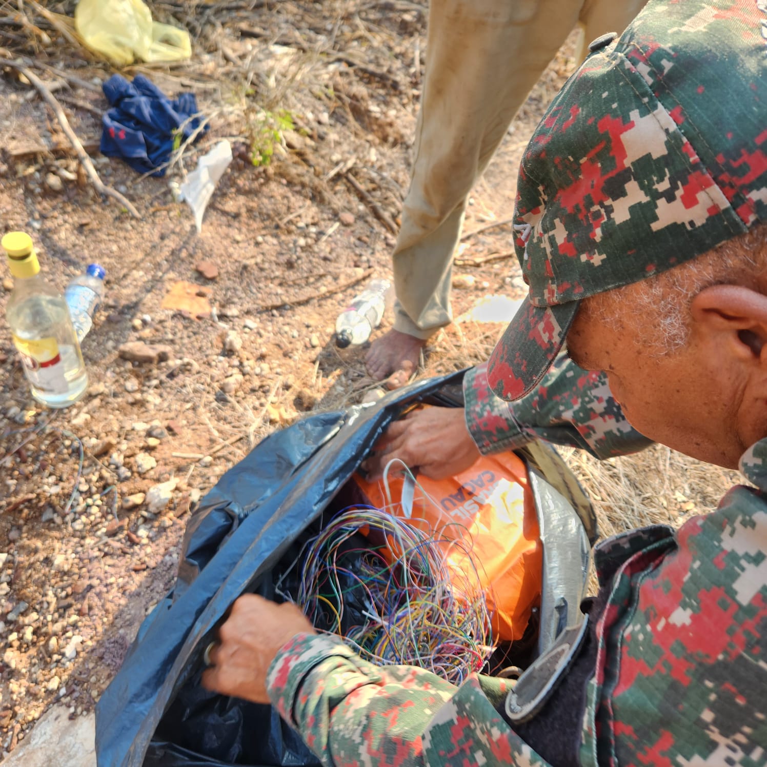 Ao chegar, a equipe encontrou o indivíduo em posse do material furtado. Ele também portava uma vara de madeira de aproximadamente dois metros, com um gancho de ferro na ponta, geralmente usada para puxar fiação elétrica. Além disso, durante a abordagem, foi localizada uma faca de mesa com o homem.