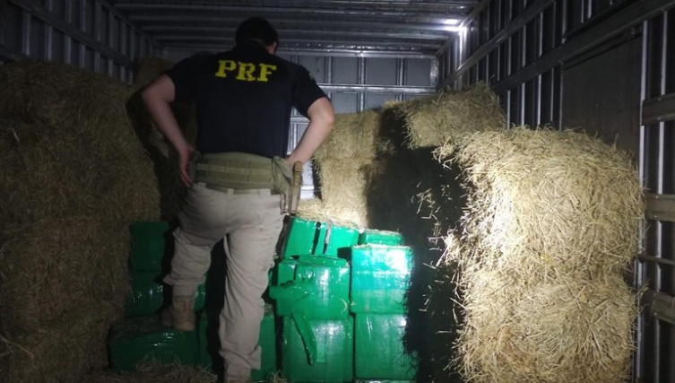 Os policiais fiscalizavam a BR-267 quando abordaram o condutor do veículo. Ele disse que transportava fardos de feno, mas durante a vistoria, os policiais encontraram grande quantidade de maconha escondida na carga.