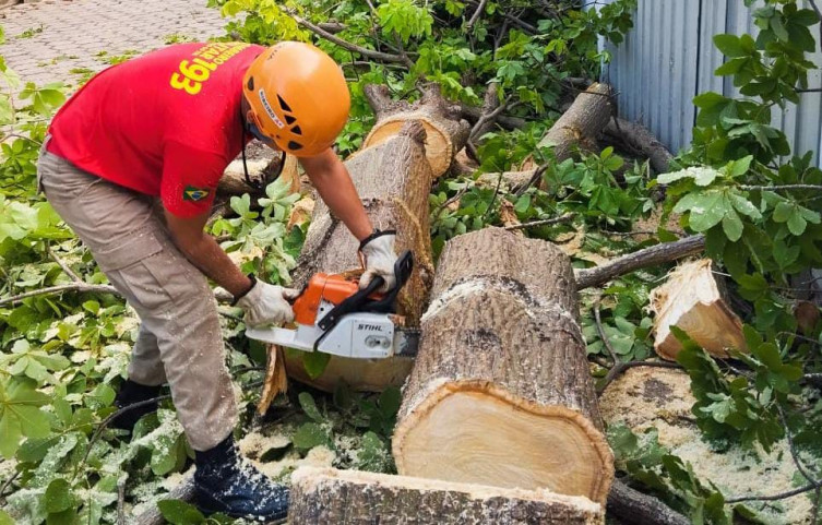 A equipe realizou a avaliação de segurança da área e, em seguida, efetuou o corte e a remoção dos galhos, liberando completamente o acesso à casa.