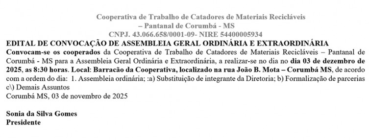 Edital de Convocação Assembleia Geral Ordinária e Extraordinária - Cooperativa de Trabalho de Catadores de Materiais Recicláveis