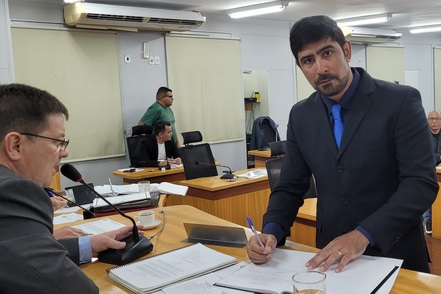 Durante a sessão, Pietro Candia fez o juramento e assinou o termo de posse ao lado do presidente do Legislativo corumbaense, vereador Ubiratan Canhete de Campos Filho.