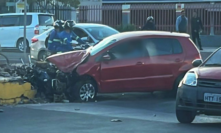 No impacto, os ocupantes da motocicleta foram arremessados e caíram no canteiro central da Rio Branco; veículo que prensou a moto foi parar na esquina com a Albuquerque