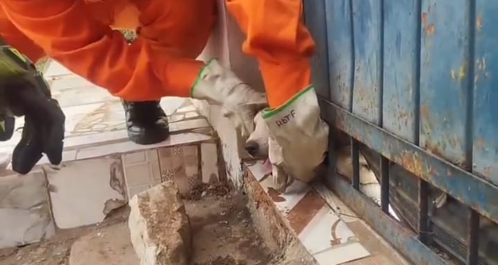 Na sequência, foi realizado um corte na grade do portão com o auxílio de um alicate de corte de alta precisão, possibilitando a retirada segura do animal. Após o salvamento, não foram constatadas lesões aparentes no cão.