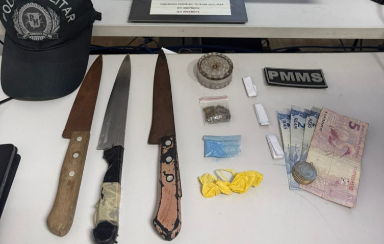 Na varredura da área, os policiais encontraram porções de maconha, pasta base de cocaína e cocaína, além de três facas com cerca de 30 centímetros de comprimento e dinheiro em espécie, entre cédulas e moedas.