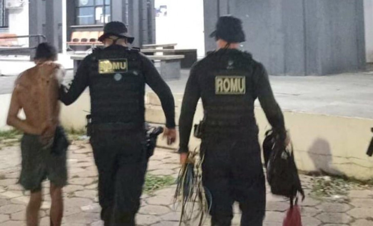 A equipe da Ronda Ostensiva Municipal (ROMU) foi acionada após denúncia de furto em andamento. Ao chegar ao local, os agentes identificaram um indivíduo na área externa da unidade. Durante a abordagem, foi encontrada uma mochila com entorpecente, um facão de aproximadamente 50 centímetros, um cachimbo para uso de drogas e um isqueiro.