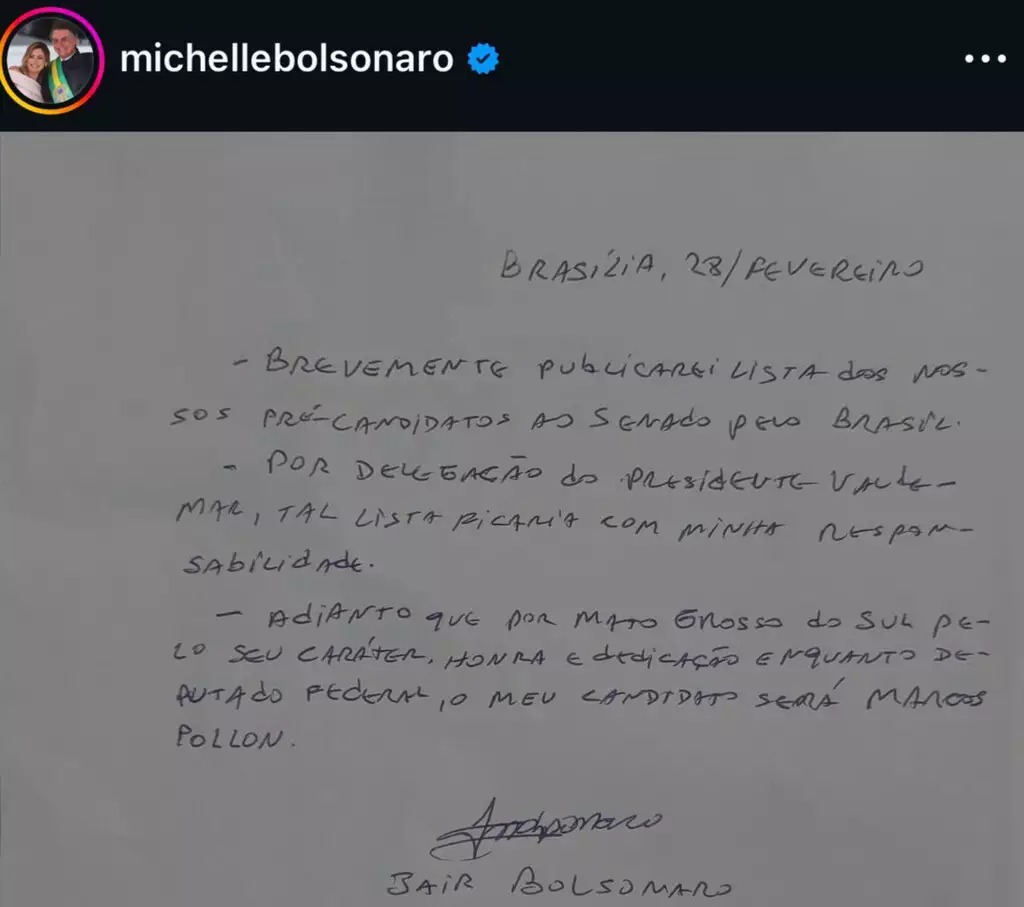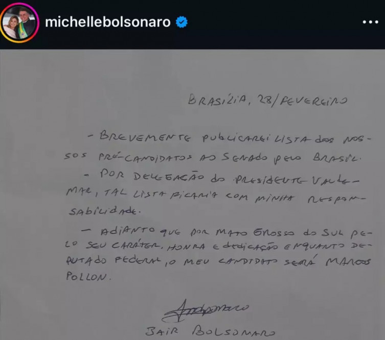 No texto, o ex-presidente afirma que publicará em breve a lista dos pré-candidatos do PL (Partido Liberal) ao Senado Federal. Ele também relata que o presidente da sigla, Valdemar Costa Neto, delegou a ele a função de definir os nomes que disputarão a vaga pela legenda.