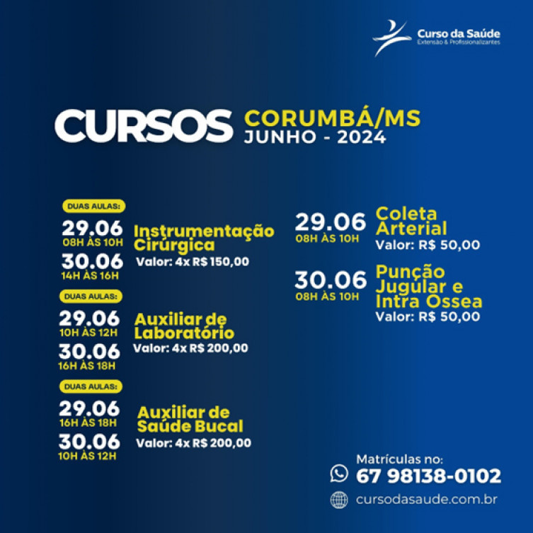 Confira abaixo a lista de cursos disponíveis em nossa unidade de Corumbá para o mês de Junho/2024