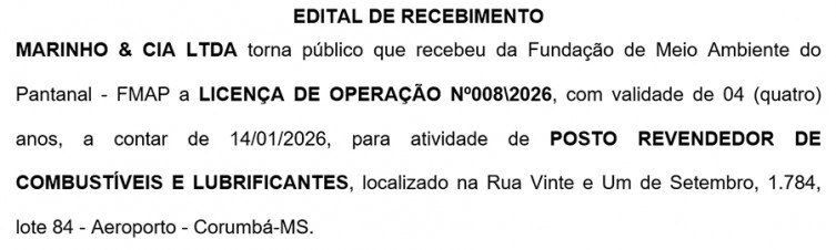 Edital de Recebimento - Licença de Operação Marinho & Cia LTDA