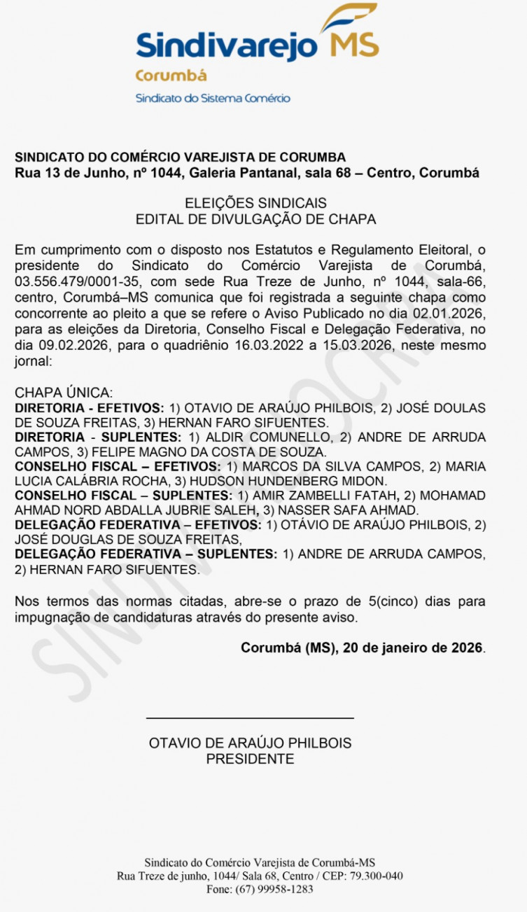 Edital de Divulgação de Chapa - Sindicato do Comércio Varejista de Corumbá