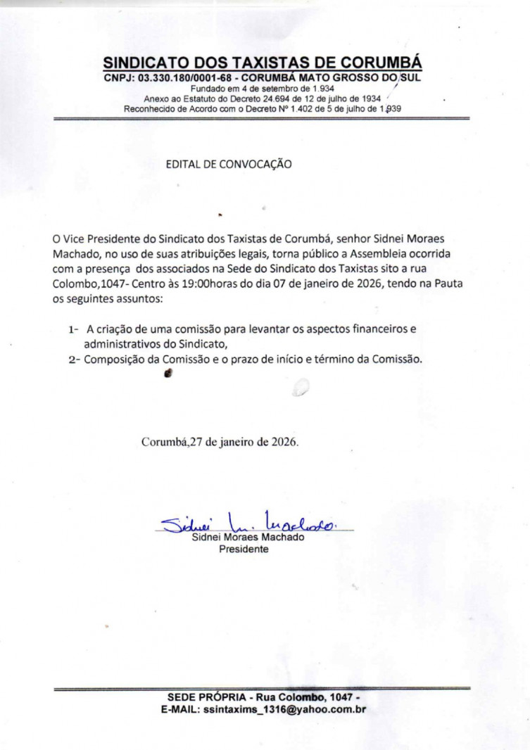 Edital de Assembleia - Sindicato dos Taxistas de Corumbá