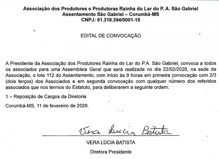 Edital de Convocação de Assembleia Geral - Associação de Produtores e Produtoras Rainha do Lar do P.A São Gabriel