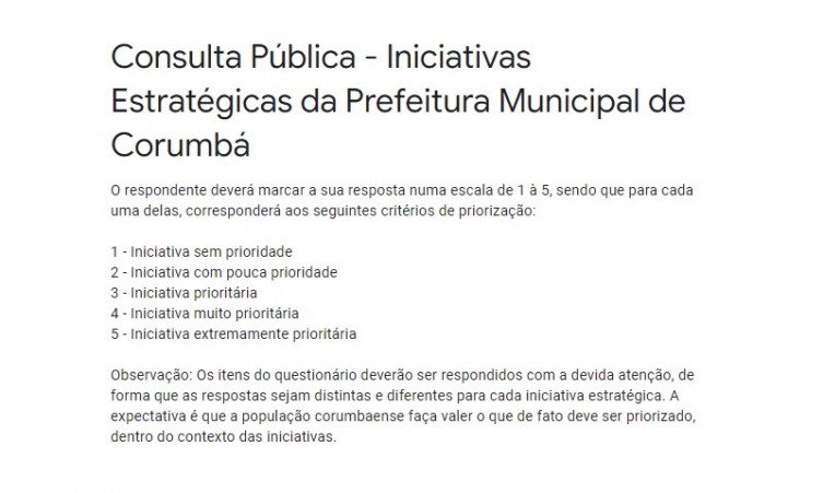 O processo de elaboração do Planejamento Estratégico é participativo e democrático. Por isso, a Prefeitura de Corumbá quer ouvir a opinião de toda a sociedade civil corumbaense sobre a priorização das iniciativas estratégicas. A sua participação é muito importante; colabore e ajude o Município a atender melhor sua população.