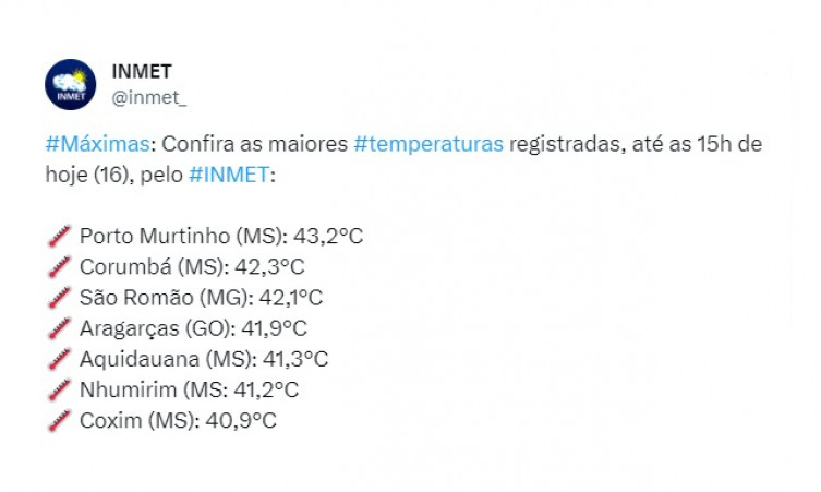 Logo em seguida, vem Corumbá, depois São Ramão (MG), com 42,1°C; Aragarças (GO), com 41,9°C e as três regiões de MS: Aquidauana - 41,3°C; Fazenda Nhumirim - 41,2°C e Coxim- 40,9°C.
