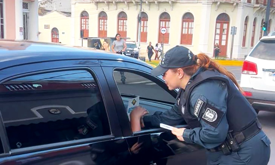 Policiais fizeram panfletagem com orientações aos condutores e pedestres no Centro de Corumbá