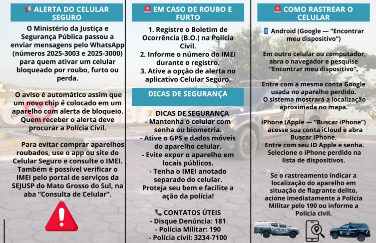 A ação orienta os cidadãos a guardarem o número do IMEI, seguirem dicas básicas de segurança e utilizarem o aplicativo Celular Seguro, do Ministério da Justiça, ferramenta que auxilia no bloqueio e rastreamento do aparelho em caso de subtração.