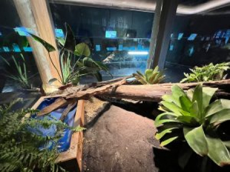 Para garantir o bem-estar do animal, o recinto foi projetado de acordo com as normas do IBAMA, incluindo substrato adequado, plantas, toca, aquecedor, umidificador, pedra aquecida, lâmpadas uva e uvb e uma área úmida que simula o ambiente natural da espécie.