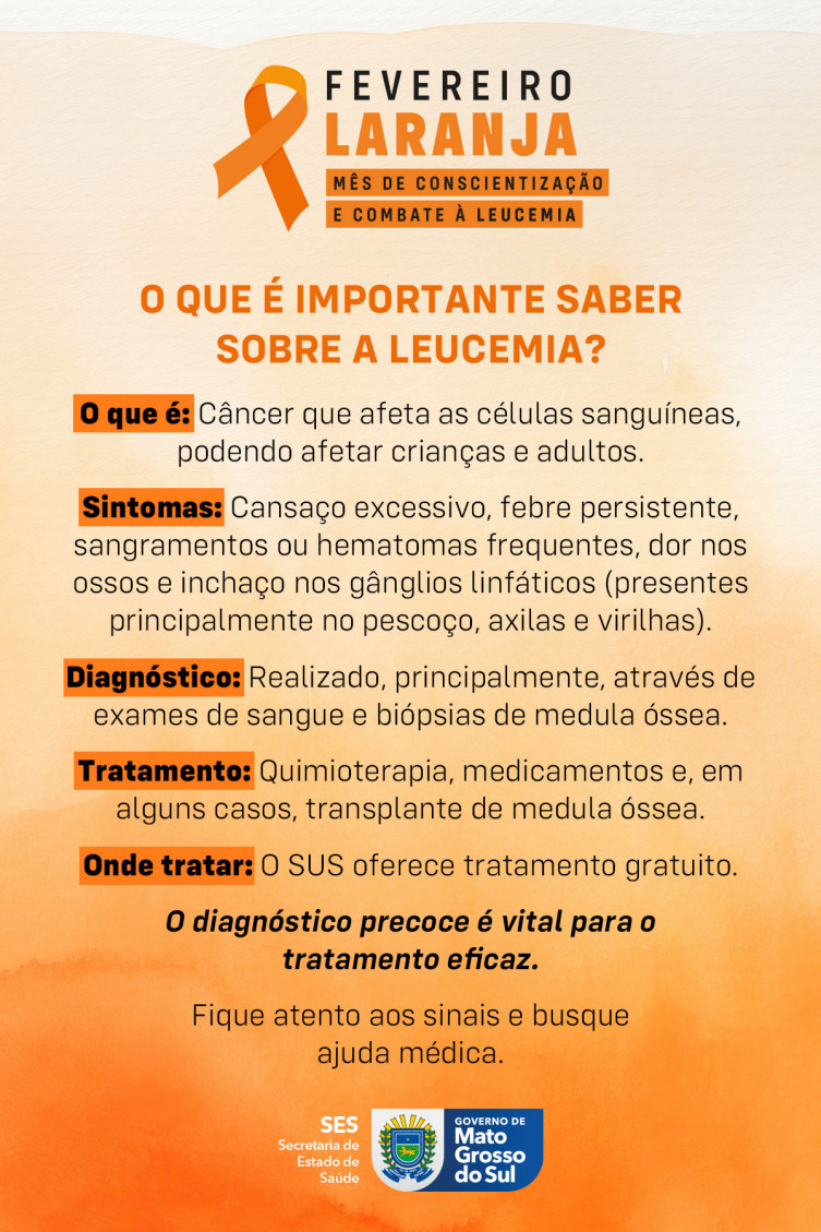 O mês de fevereiro é marcado pela campanha Fevereiro Laranja, dedicada à conscientização sobre a leucemia, um tipo de câncer do sangue que afeta milhares de pessoas. A informação é o primeiro passo para a cura, alerta a SES (Secretaria de Estado da Saúde) sobre a relevância da detecção precoce para aumentar as chances de sucesso no tratamento e salvar vidas.