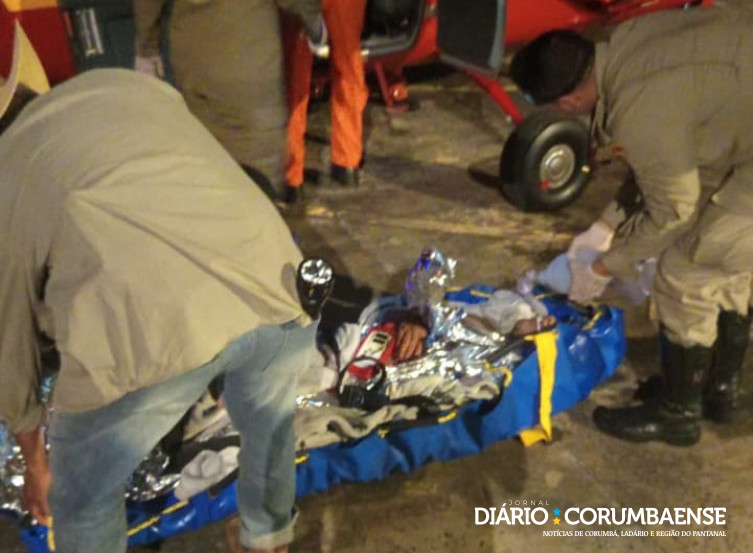 Bombeiros socorrendo a vítima, que foi transportada de avião para a Capital