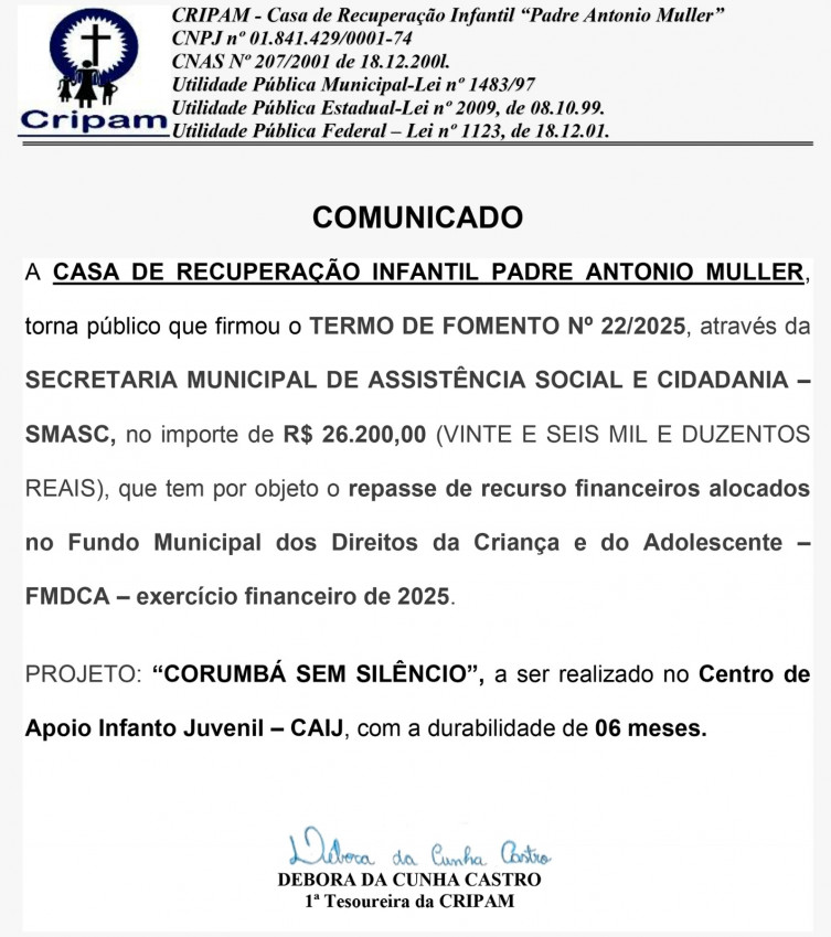 Comunicado da Casa de Recuperação Padre Antonio Muller