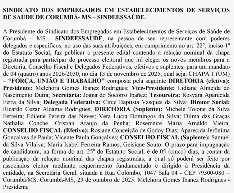 Edital Eleições 2025 do do SINDEESSAÚDE